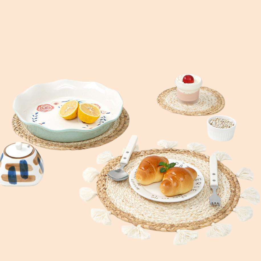 자연 소재 일식 테이블 매트, 왕골·옥수수 껍질·호리병박 사용, 친환경·내구성 우수, 다양한 인테리어에 조화